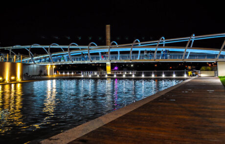 The new 627-foot, waterfront pedestrian connector, which runs parallel to the riverfront, is a result of a successful partnership between Forest City Washington, the DC Government, and DC Water. It is 20 feet wide and surfaced by boardwalk, reflective in design to the adjacent riverfront esplanade of The Yards Park.
